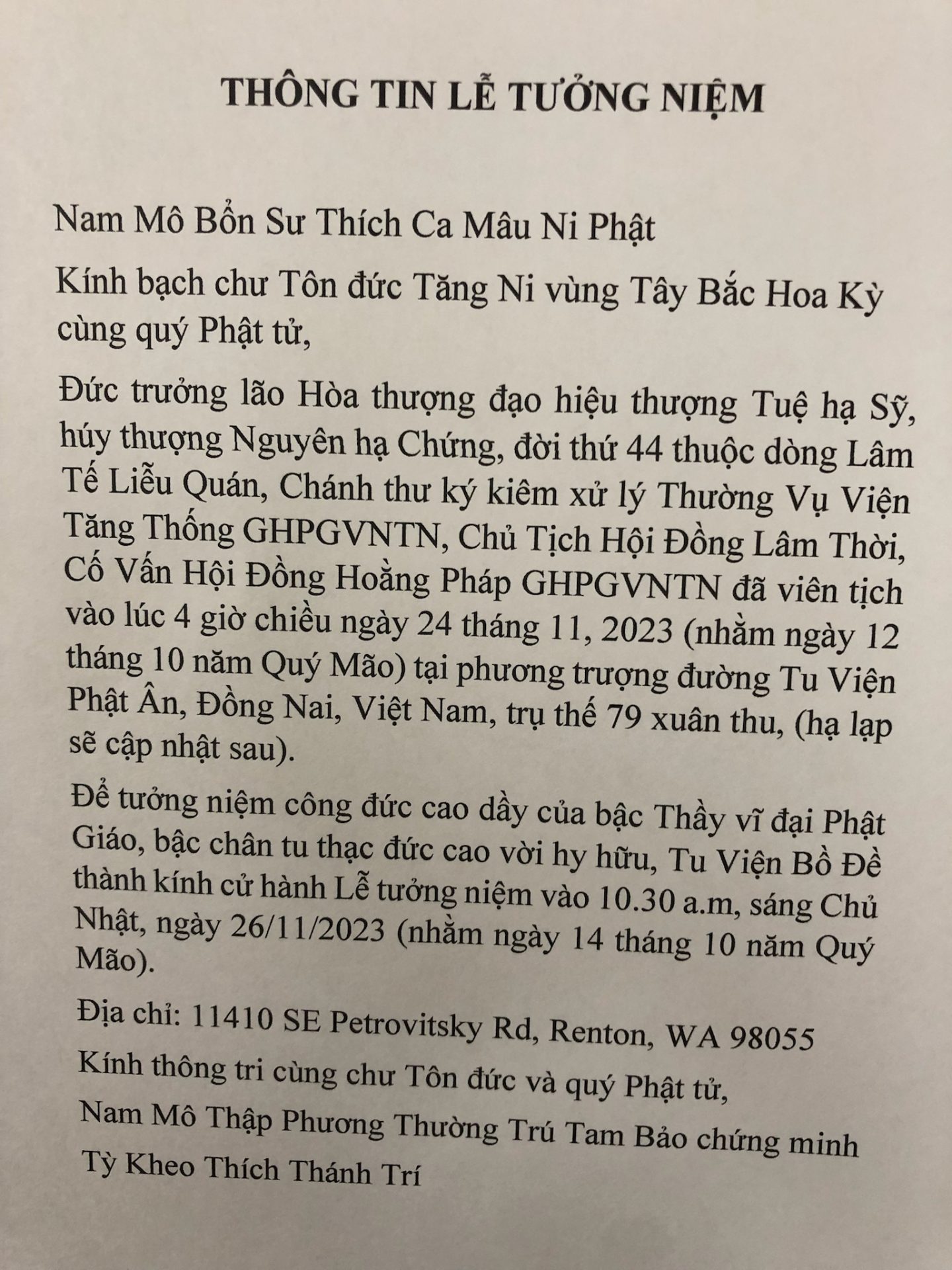 THÔNG TIN LỄ TƯỞNG NIỆM